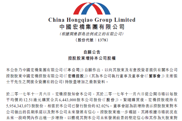 中國(guó)宏橋近日發(fā)布公告稱,其控股股東宏橋控股知會(huì)公司,將于2017年11月6日從公開市場(chǎng)以每股均勻價(jià)約12.51港元購置合共644.3萬股公司股份。緊隨購置后,宏橋控股現(xiàn)持有約59.54億股股份,相當(dāng)于公司已發(fā)行股份約82.02%。記者從公開材料查詢后發(fā)現(xiàn),宏橋控股為公司執(zhí)行董事及董事會(huì)主席張士平間接全資具有的公司。