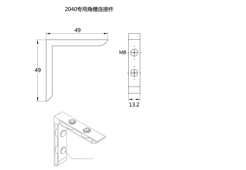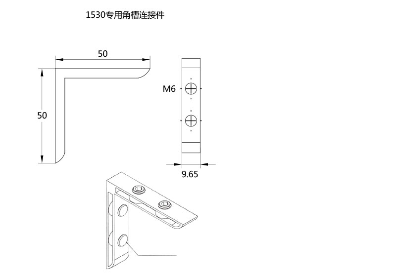 用于1530型材45度連接,安裝時(shí)將其兩端分別插入型材槽坑內(nèi),將緊固螺絲鎖緊。
