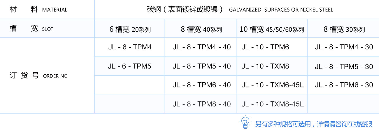 彈片螺母塊能被直接塞進(jìn)鋁型材槽坑中的任意裝配點(diǎn),他背部的彈片能撐起并固定它的位置,使安裝十分簡(jiǎn)單且可靠,它是型材連接中使用較多的配件之一。